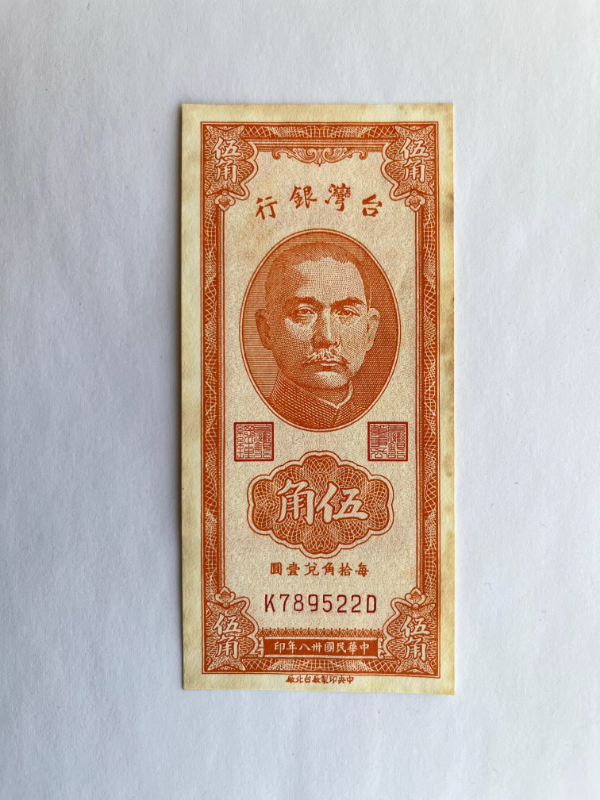 China, 5 Jiao, 1949, Bank of Taiwan, Used Condition, AUNC Original Banknote for Collection
