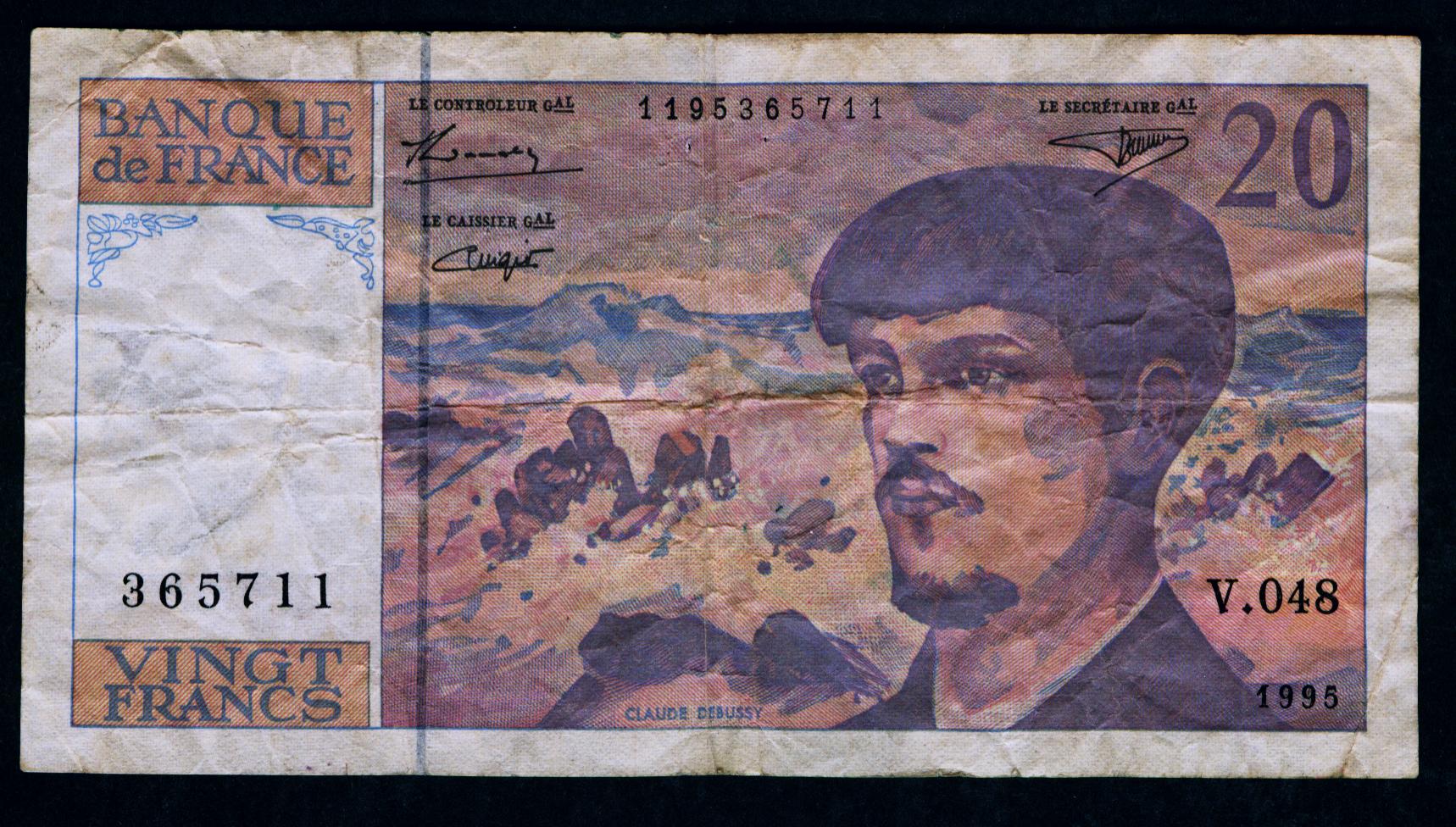 France, 20 Francs, 1990-1998 Random Year, Used F-XF Condition, Expired, Banknote for Collection